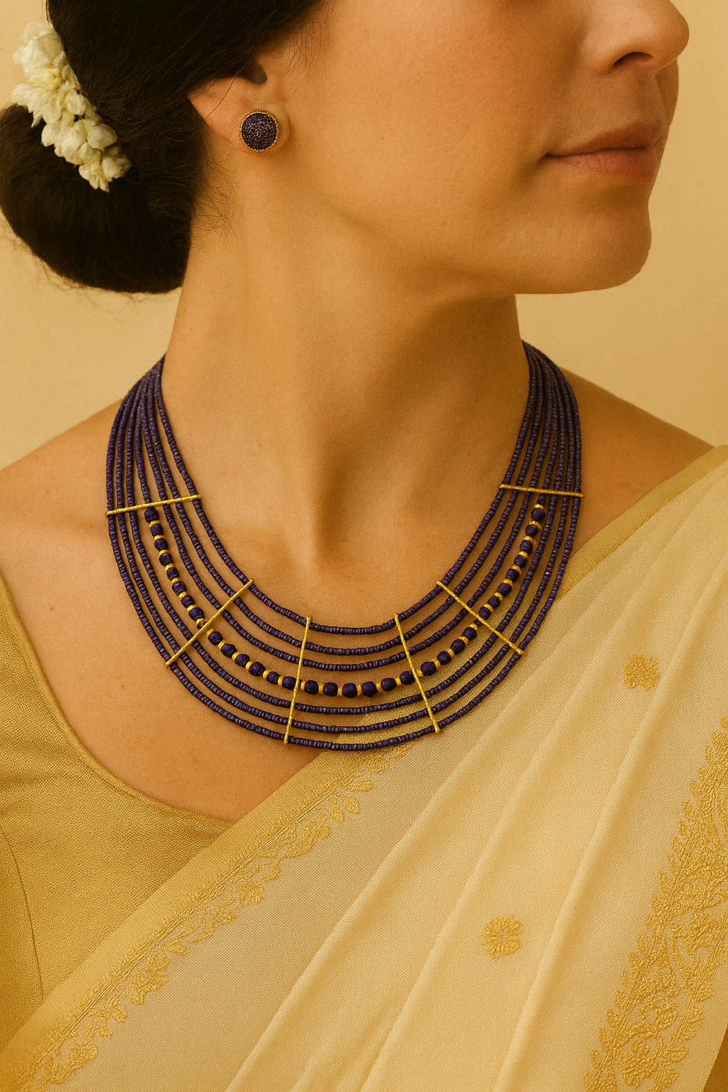 Each layer is accented with gold-toned beads and separators, adding texture, shine, and structure to the cascading design. The multi-strand layout sits beautifully on the neckline, creating an elegant, rounded silhouette that enhances both casual and festive outfits.
